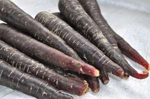 So what to do with these regal coloured vegetables? What not to do with them is certainly don’t boil them! If you intend to peel them be prepared for stained hands – you will quickly see why they are used as a natural dye! It’s probably a good idea if you’re trying them for the first time, to simply steam them to experience the true taste of these carrots. Although similar to the common orange carrot, you will notice a sweetness and earthiness most like fresh beetroot. Magnificent roasted as well as pureed, I have also seen them added to cake batter (giving a dirty blueberry hue to the cooked cake). When grated and put into coleslaw, the juice from the carrots gives the dressing a unique pinky purple tinge. Purple carrot juice – something we’ve had in our fridge for quite a while – is delicious but ultimately we use it for it’s positive health benefits. So there is nothing you can do with an orange carrot that you can’t do with a purple one – and vice versa.